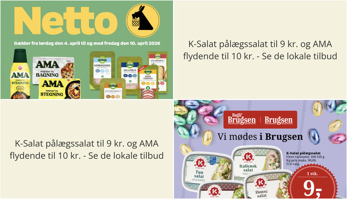 DagliBrugsen tilbyder et udvalg af K-Salat pålægssalater, herunder tun salat, italiensk salat, kylling & baconsalat og hønsesalat. Hver salat vejer mellem 100-150 g og koster kun 9 kr. pr. stk. Tilbuddet gælder fra torsdag den 2. april til og med torsdag den 9. april.